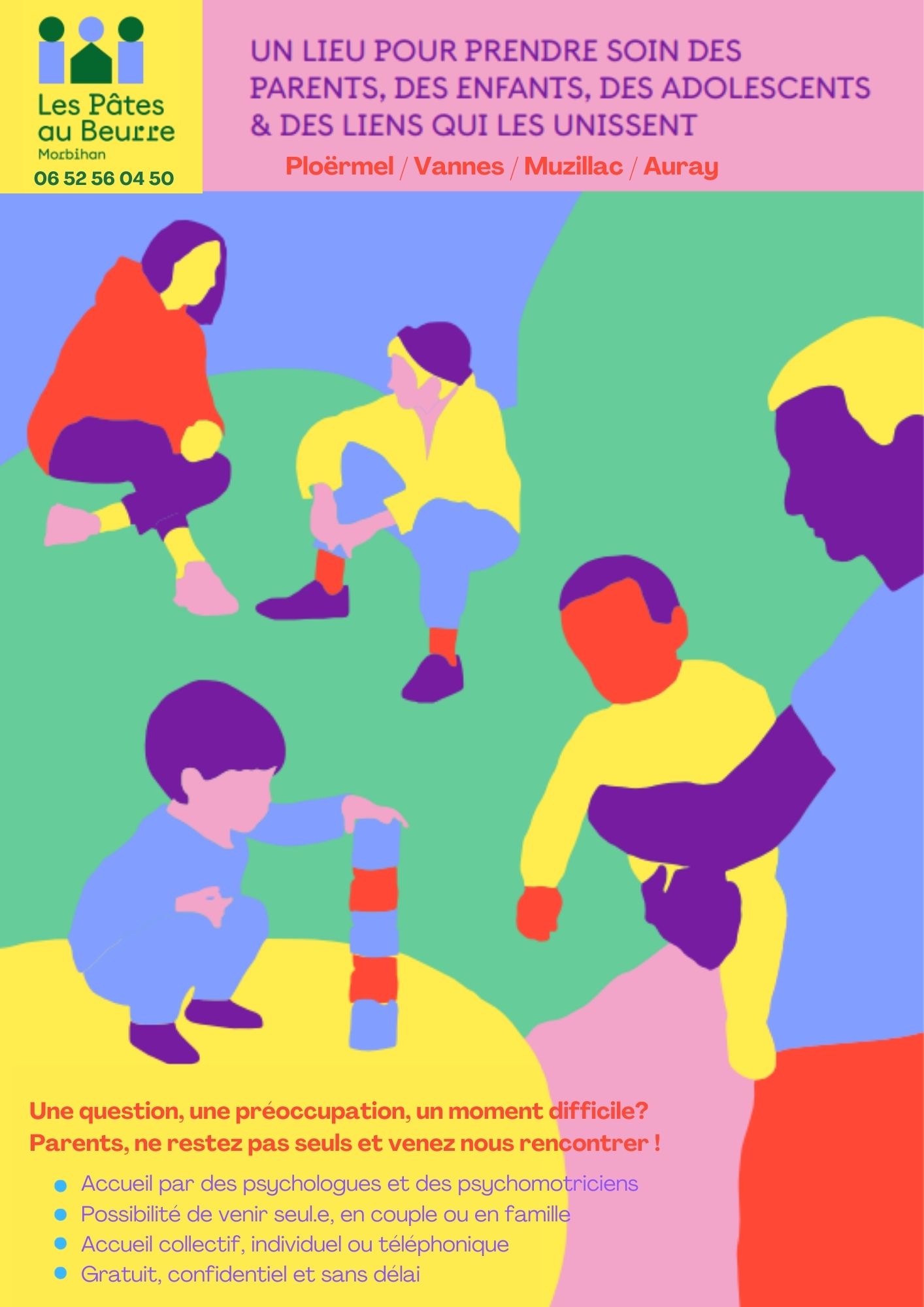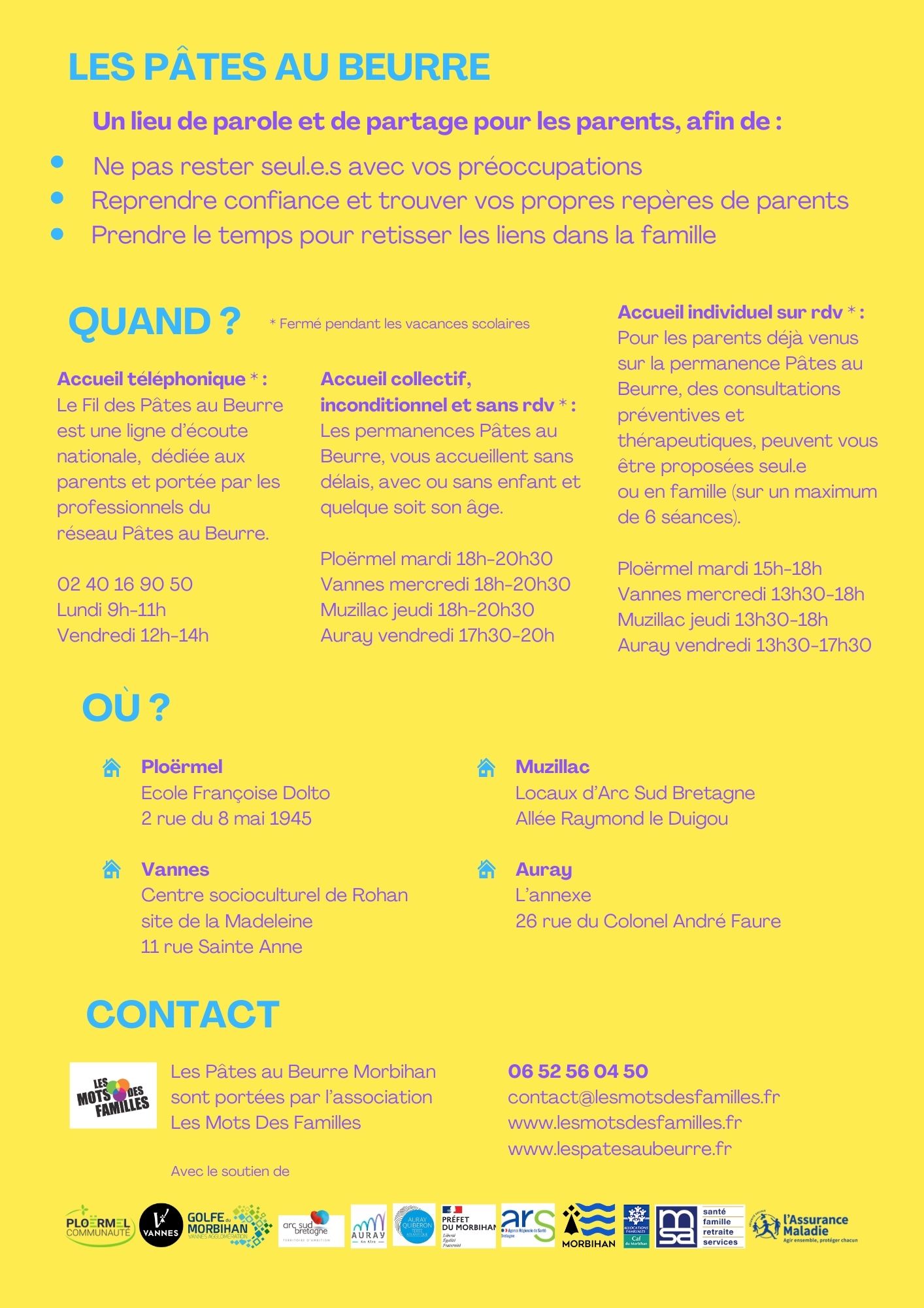 L'association Les Mots des Familles est adhérente de la Fédération depuis 2014 et à ce titre, a pu ouvrir ses lieux d’accueil Pâtes au Beurre dans le Morbihan. D'abord à Vannes en avril 2015, puis à Ploërmel en septembre 2018, à Muzillac en mars 2021 et enfin Auray en janvier 2025.
